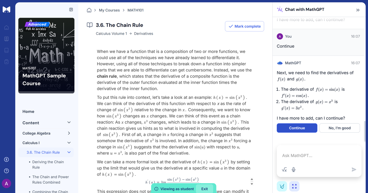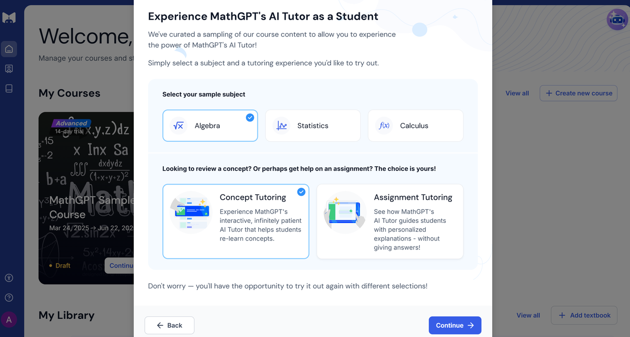 - جرب MathGPT.AI إذا كنت تعطي الأولوية للتكامل السلس مع المناهج الرسمية (مثل كتب OpenStax) وتحتاج إلى منصة مصممة للمدرسين لإدارة الواجبات على نطاق واسع. يناسب معلم الذكاء الاصطناعي المحادثاتي ولوحة مفاتيح LaTeX الطلاب الذين يزدهرون في بيئات التعلم المنظمة المعتمدة على سطح المكتب.
