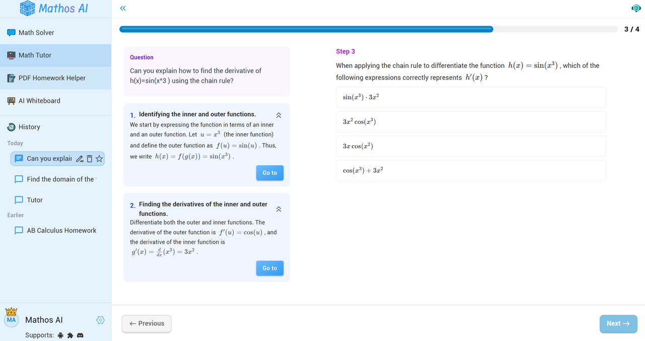 يوفر Mathos AI شرحًا مفصلًا ومنظمًا خطوة بخطوة للمفاهيم الرياضية. استجابةً لسؤال المستخدم حول التفاضل لـ باستخدام قاعدة السلسلة، يقوم Mathos AI بتفكيك المشكلة إلى خطوات رئيسية. يساعد Mathos AI أولاً المستخدم على التعرف على الدالة الداخلية والدالة الخارجية، ثم يشرح كيفية تفاضل كل دالة على حدة. يوجه المستخدم في تطبيق قاعدة السلسلة ويقدم خيارات متعددة للاختيار من بينها للحصول على المشتق الصحيح. بالإضافة إلى الشروحات النصية، يقوم Mathos AI بإنشاء دروس فيديو في الوقت الحقيقي لتوجيه الطلاب بصريًا من خلال مفاهيم الرياضيات المعقدة.
