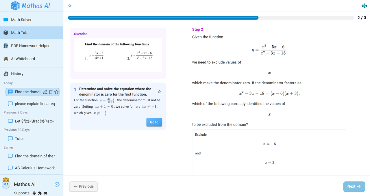 يتيح لك Mathos AI بدء مشكلة على هاتفك أثناء الغداء، ثم إنهائها لاحقًا على الكمبيوتر المحمول الخاص بك، دون فقدان مكانك. إنه كالسحر! سواء كنت ترسم المعادلات المعلمية على جهاز لوحي، أو تكتب على الكمبيوتر، أو تلتقط صورة لواجبك المنزلي، يتذكر Mathos AI بالضبط أين توقفت.
