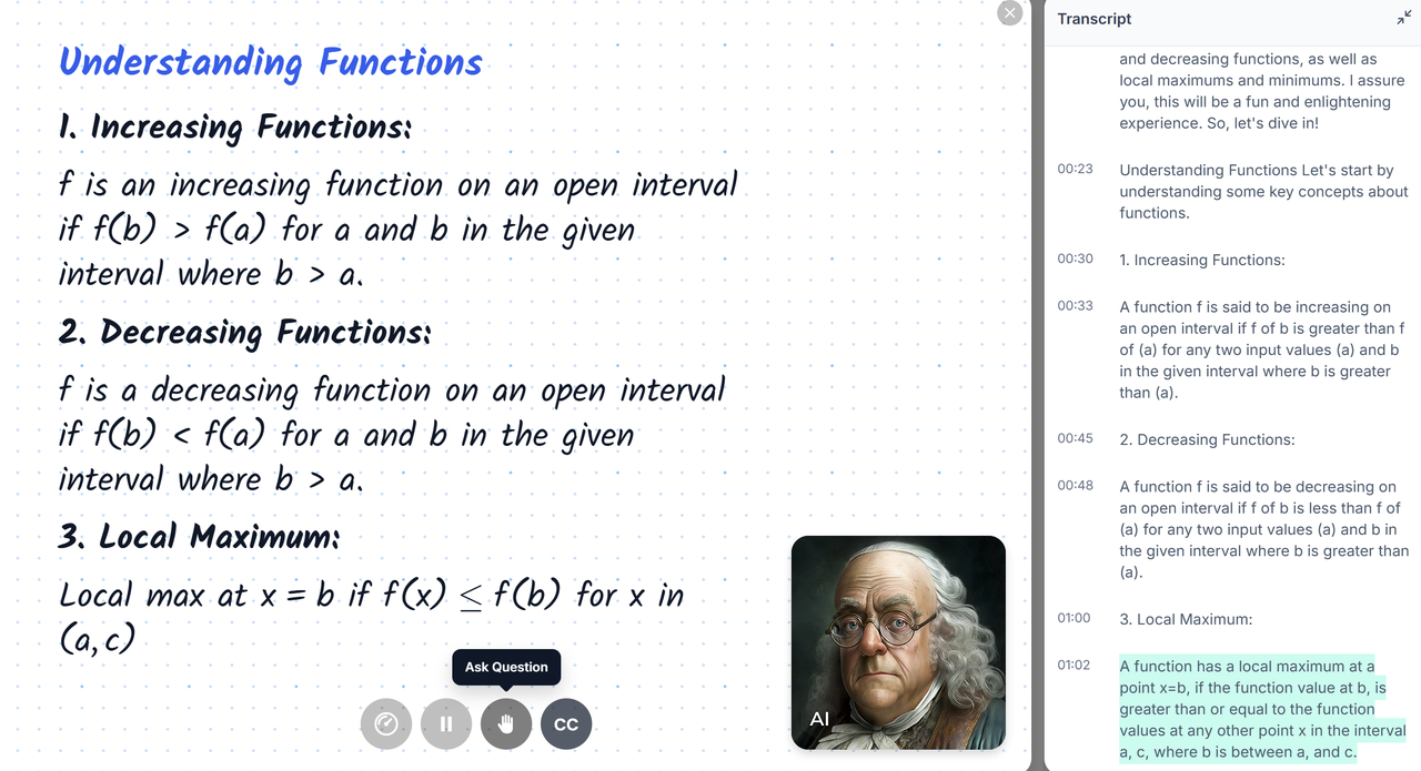 MathGPT.AI يشبه أمين مكتبة ودود يمنحك وصولاً مجانياً إلى كتب الرياضيات! إنه يعمل مع OpenStax، مكتبة من الكتب المدرسية المجانية التي تستخدمها العديد من المدارس. تخيل أن لديك معلم روبوت يساعدك في حل المشكلات داخل كتابك المدرسي دون أي تكلفة إضافية! كما يوفر MathGPT للطلاب مقاطع فيديو توضيحية. عندما تشاهد مقاطع الفيديو المدعومة بالذكاء الاصطناعي المقدمة من MathGPT.AI، ستجد بشكل مدهش أن معلمك هو بنيامين فرانكلين! إنه يشرح لك مفهوم الرياضيات الذي اخترته بعناية. إذا كنت غير مألوف بأي نقطة، فقط اطرح سؤالاً عن طريق الكتابة على لوحة المفاتيح أو استخدام الميكروفون. سيعطيك فرانكلين إجابة سريعة. إنه مثالي للطلاب الذين يرغبون في متابعة الدروس خطوة بخطوة، تماماً كما في الفصل.