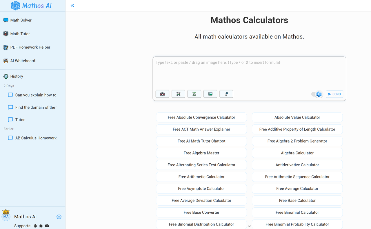 - مدخلات متعددة الأنماط: كلاهما يسمحان بإدخال النص والصوت، لكن Mathos AI يضيف الكتابة اليدوية وتحميل الصور لمرونة أكبر.