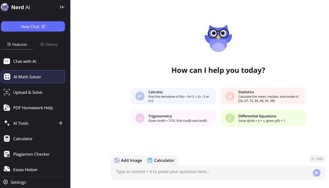 - Nerd AI، من ناحية أخرى، يقدم مزيجًا فريدًا من الوصولية والوظائف. يمكن للمستخدمين التقاط صور لأسئلة الرياضيات المكتوبة بخط اليد أو المطبوعة باستخدام تقنية OCR، كتابة المعادلات باستخدام لوحة مفاتيح رياضية مخصصة، أو حتى طرح الأسئلة شفهيًا للحصول على مساعدة بدون استخدام اليدين. بالإضافة إلى حل مشاكل الرياضيات، يدعم Nerd AI تحليل PDF للواجبات المنزلية أو الأبحاث، تحسين مقتطفات الشيفرة، وحلول بعدة لغات. تجعل مرونته منه أداة بارزة للطلاب الذين يحتاجون إلى أكثر من مجرد مساعدة في الرياضيات.