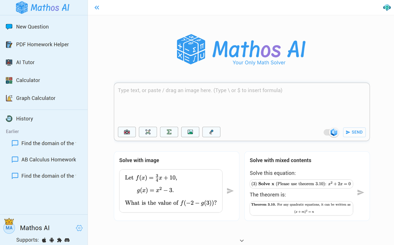 يمكن للمستخدمين التقاط صورة لأسئلة الرياضيات المكتوبة بخط اليد أو المطبوعة باستخدام تقنية OCR (التعرف الضوئي على الحروف)، مما يتيح حلولًا فورية مع شروحات خطوة بخطوة. تتيح لوحة المفاتيح الرياضية المخصصة للمستخدمين كتابة المعادلات أو الصيغ المعقدة مباشرة، مما يجعلها مثالية للمشكلات الرمزية أو الهيكلية. للحصول على مساعدة بدون استخدام اليدين، يمكن للمستخدمين طرح الأسئلة شفهيًا، والتي يقوم الذكاء الاصطناعي بمعالجتها لتقديم الإجابات.
