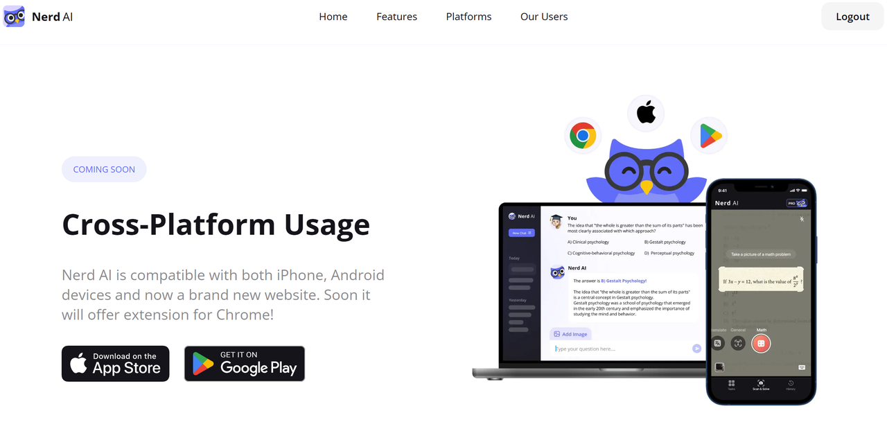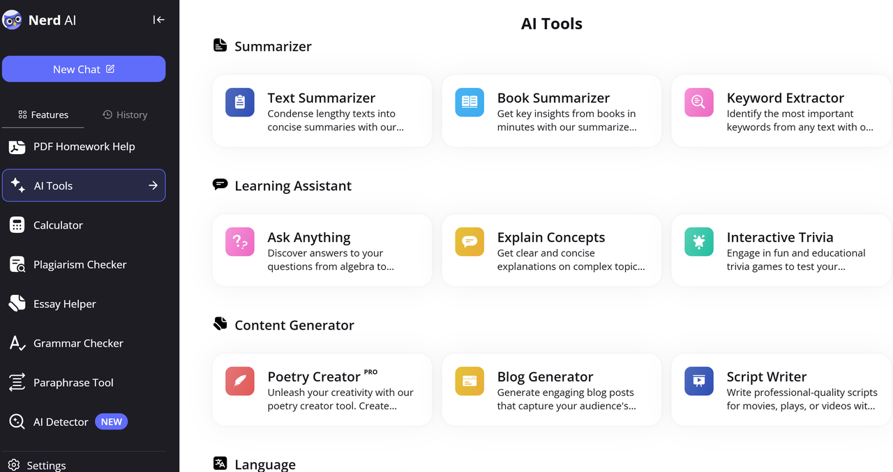 - جرب Nerd AI إذا كنت بحاجة إلى أداة تتجاوز حل مسائل الرياضيات. إن إطار التعلم التكيفي الخاص به، وتقنية OCR، والتكامل الوظيفي مع أدوات البرمجة تجعلها مثالية للطلاب الذين يحتاجون إلى مساعدة بدون استخدام اليدين أو دعم في البحث عن الواجبات المنزلية بعدة لغات.