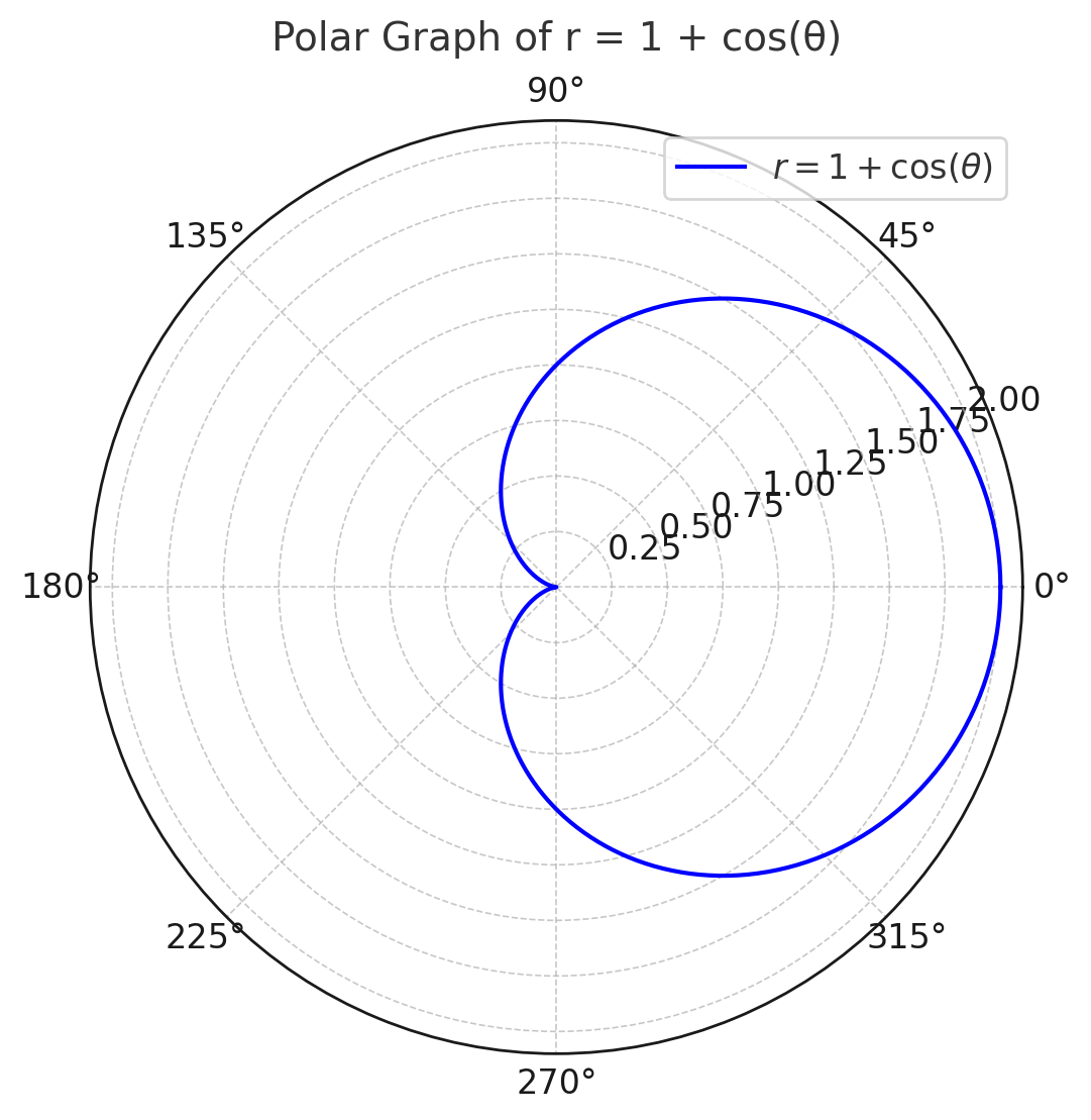 An example of a polar function is the cardioid: r = 1 + cos(θ).