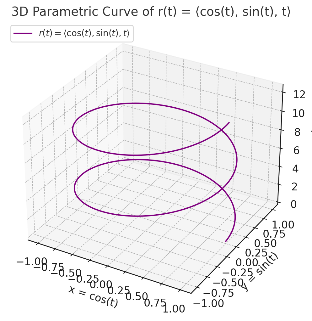 For example, a vector-valued helix function: r(t)= (cos(t), sin(t), t) creates a spiral path by circling around (cos(t), sin(t)) and rising vertically (t). As t increases, the path winds up and rises.