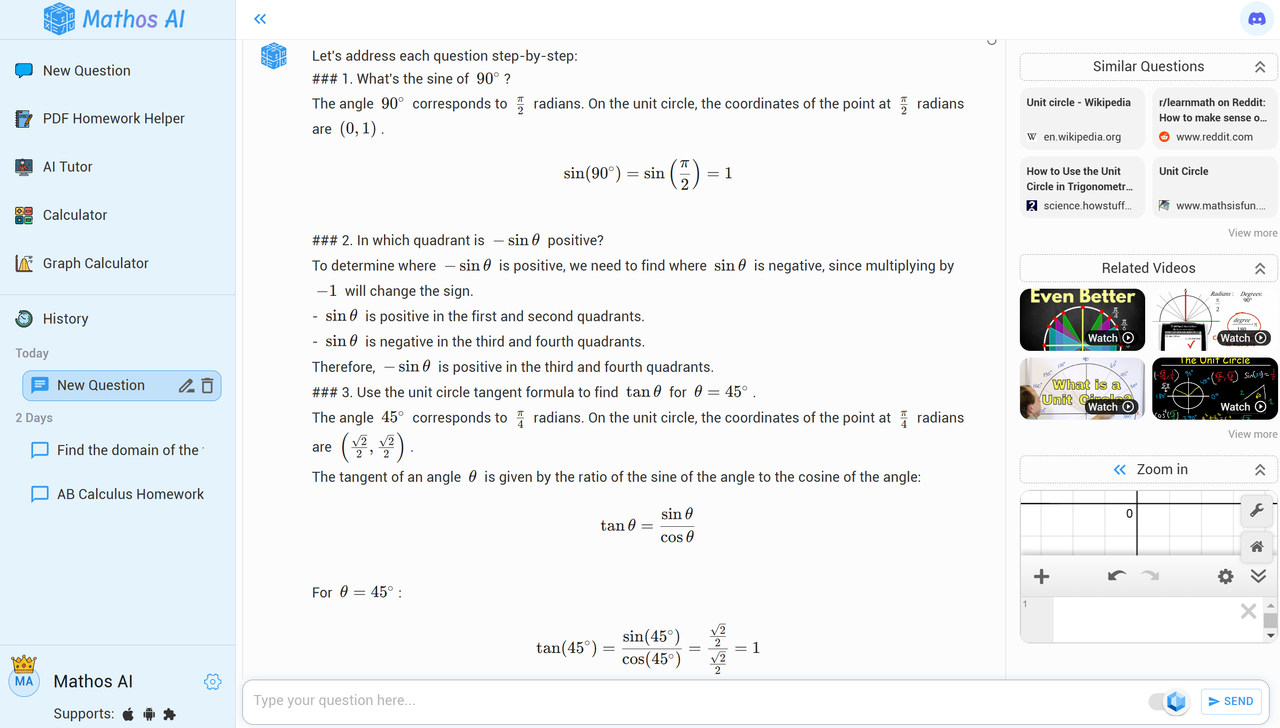 When in doubt, let technology help. A unit circle calculator is "a gem" that can quickly confirm your answers or show you step-by-step solutions. This is especially handy when figuring out sine, cosine, or tangent for less obvious angles. If you want to learn more about trigonometry, then use Mathos AI's Trigonometry Calculator to solve more trigonometric questions for you, letting you visualize sine, cosine, tangent, and more. Before tapping into your unsolved questions, you can learn some trigonometry background first.