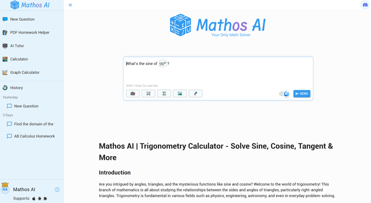 Trusted by over 2 million, Mathos AI combines a powerful graphing calculator, all-in-one math calculators, and an AI tutor to help you understand and solve complex problems step by step. Do you need help plotting trigonometry or solving a tricky equation? Mathos AI offers instant and accurate solutions with explanations tailored to your pace and style. Mathos AI’s solutions are built on an advanced model that offers 20% higher accuracy than ChatGPT. So you can confide in the answer Mathos AI provides. Need help with assignments? Use the PDF Homework Helper: Upload, edit, or snap photos of your assignments for quick, reliable answers. It’s like having a tutor available 24/7.