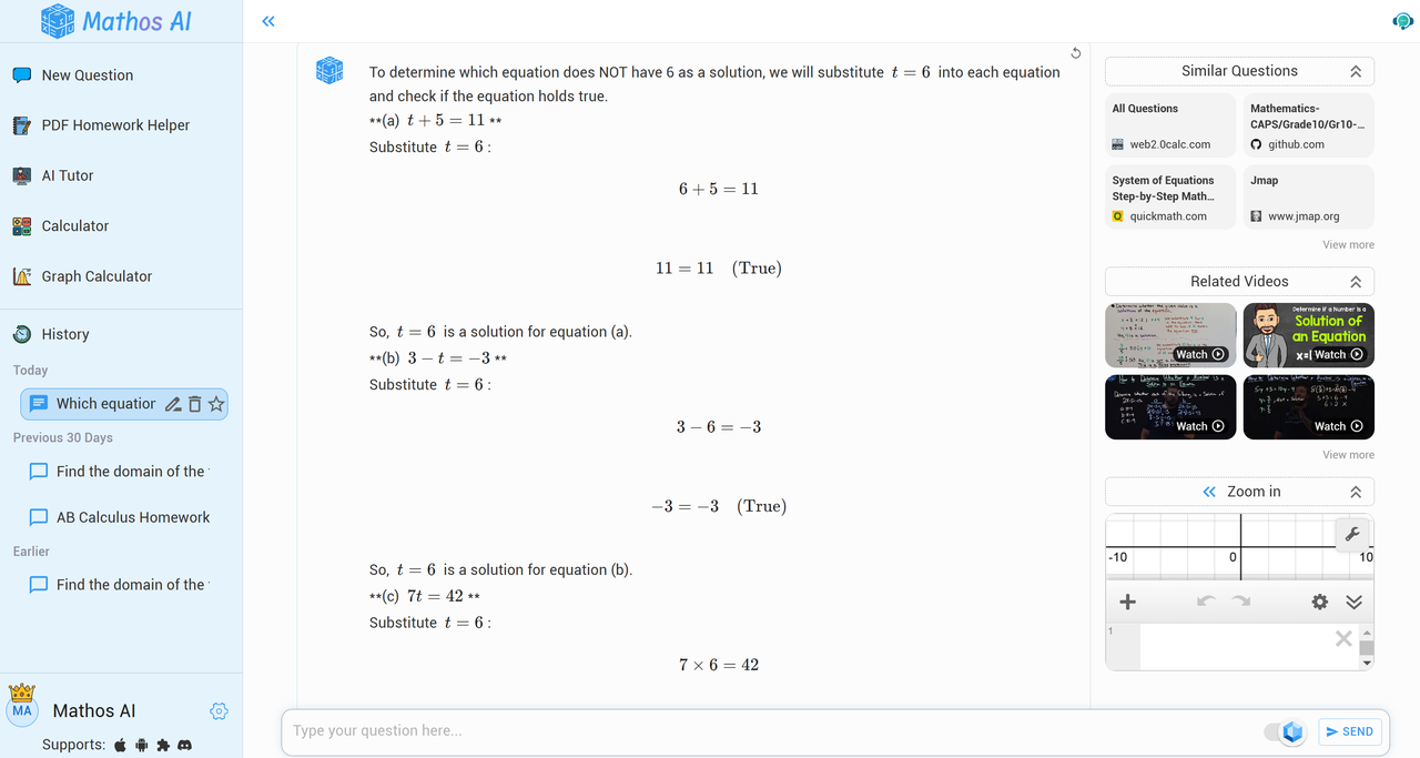 Among these powerful tools, the Mathos AI Graph Calculator, integrated with Desmos graphing technology, offers an intuitive way to explore algebra, trigonometry, and calculus concepts. Students can plot functions, visualize equations, and receive step-by-step explanations to deepen their understanding.