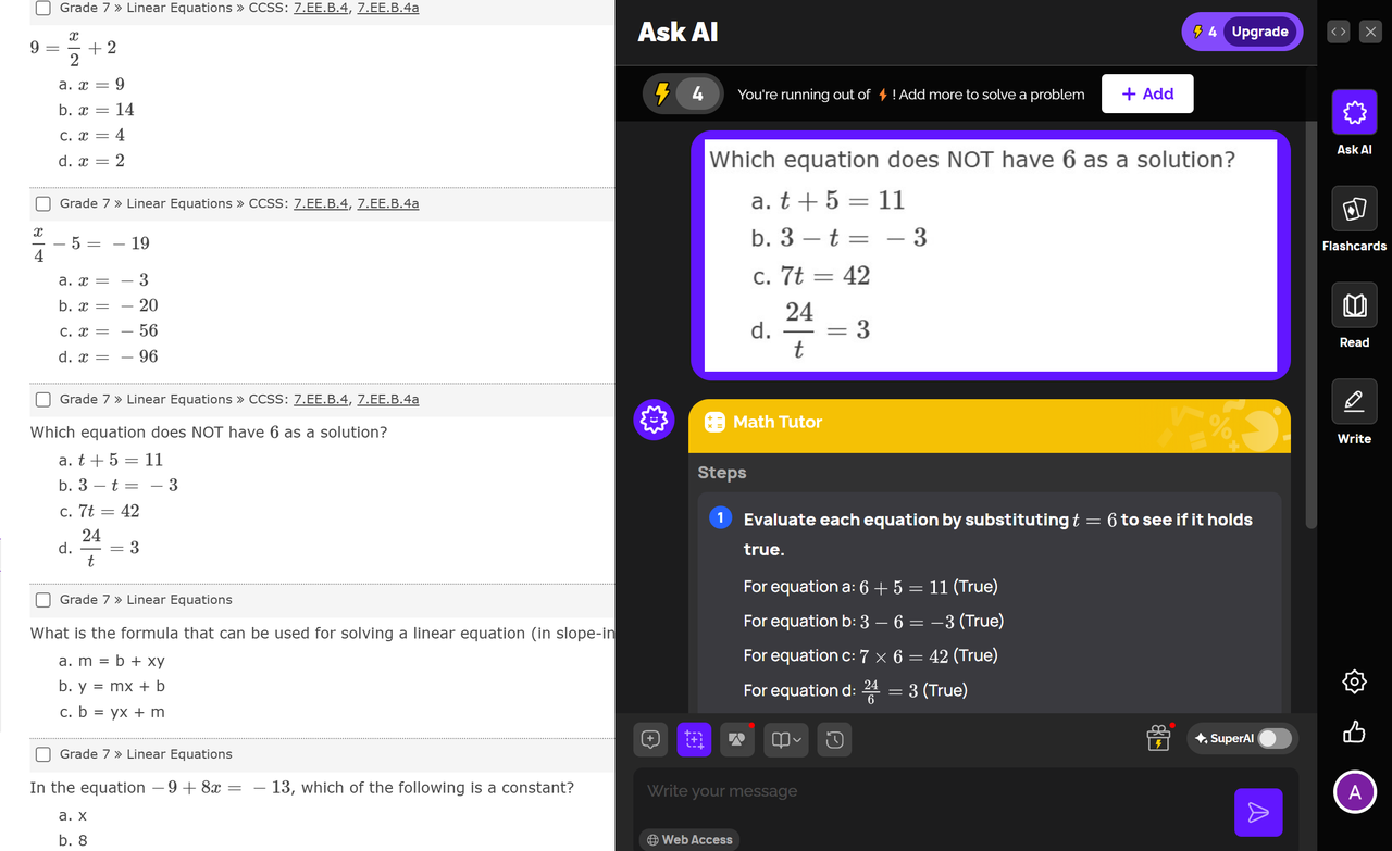We put both Mathos AI and Answer.AI to the test with a common linear equation question. The question asks which equation does NOT have 6 as a solution: