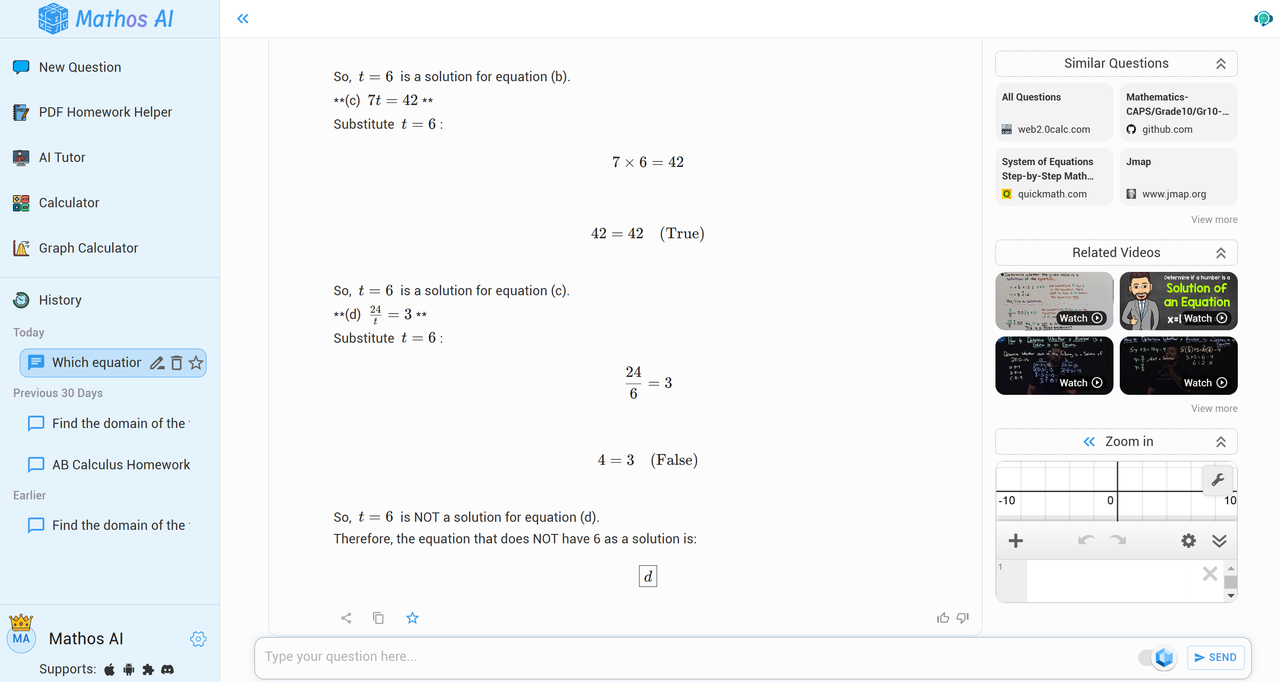 - Choose Mathos AI if you need specialized support in mathematics, especially for complex problem-solving. With its advanced capabilities like personalized AI tutoring, PDF Homework Helper, and dedicated math calculators for various topics, Mathos AI is designed to provide in-depth solutions and clear, step-by-step guidance, making it the perfect choice for math-focused learners.